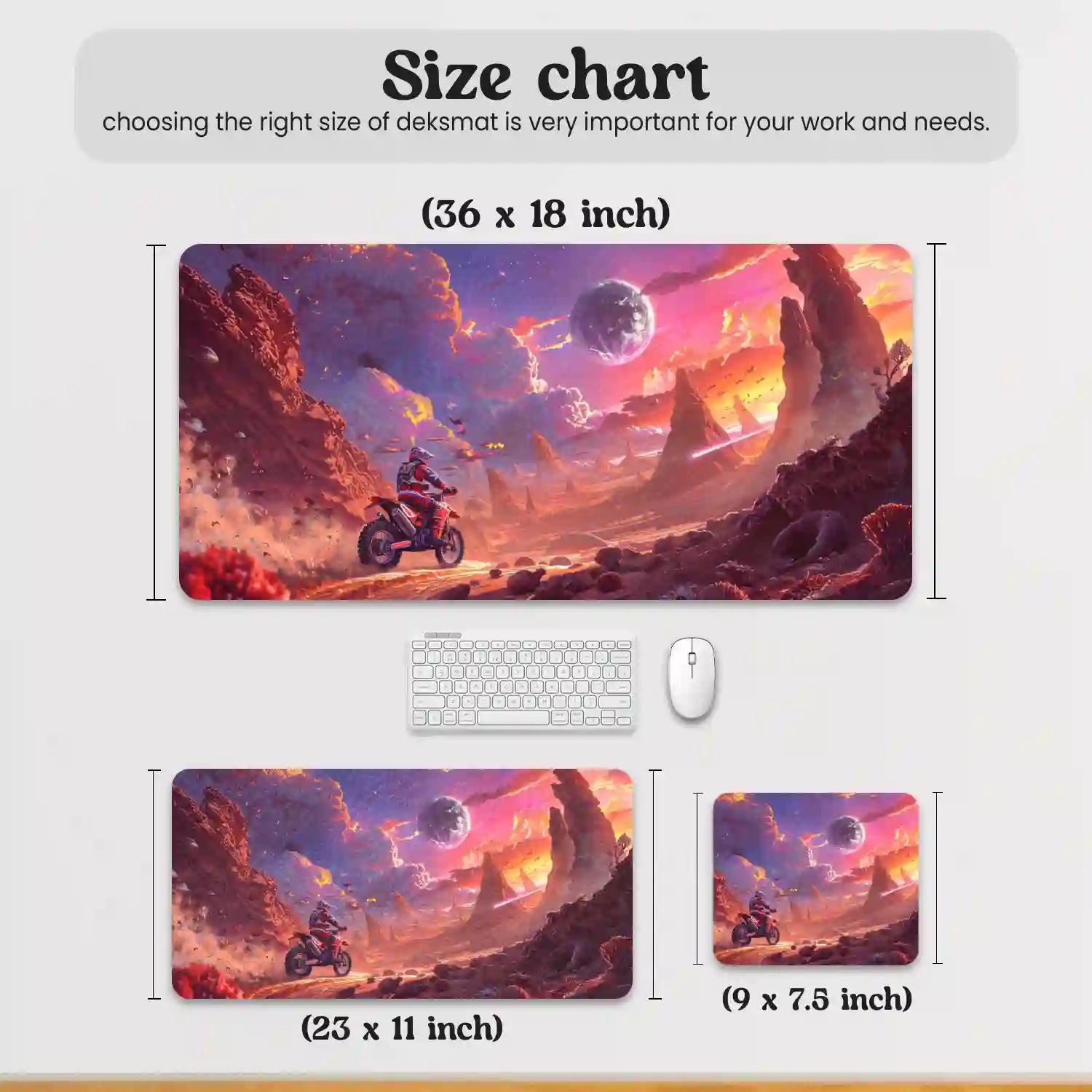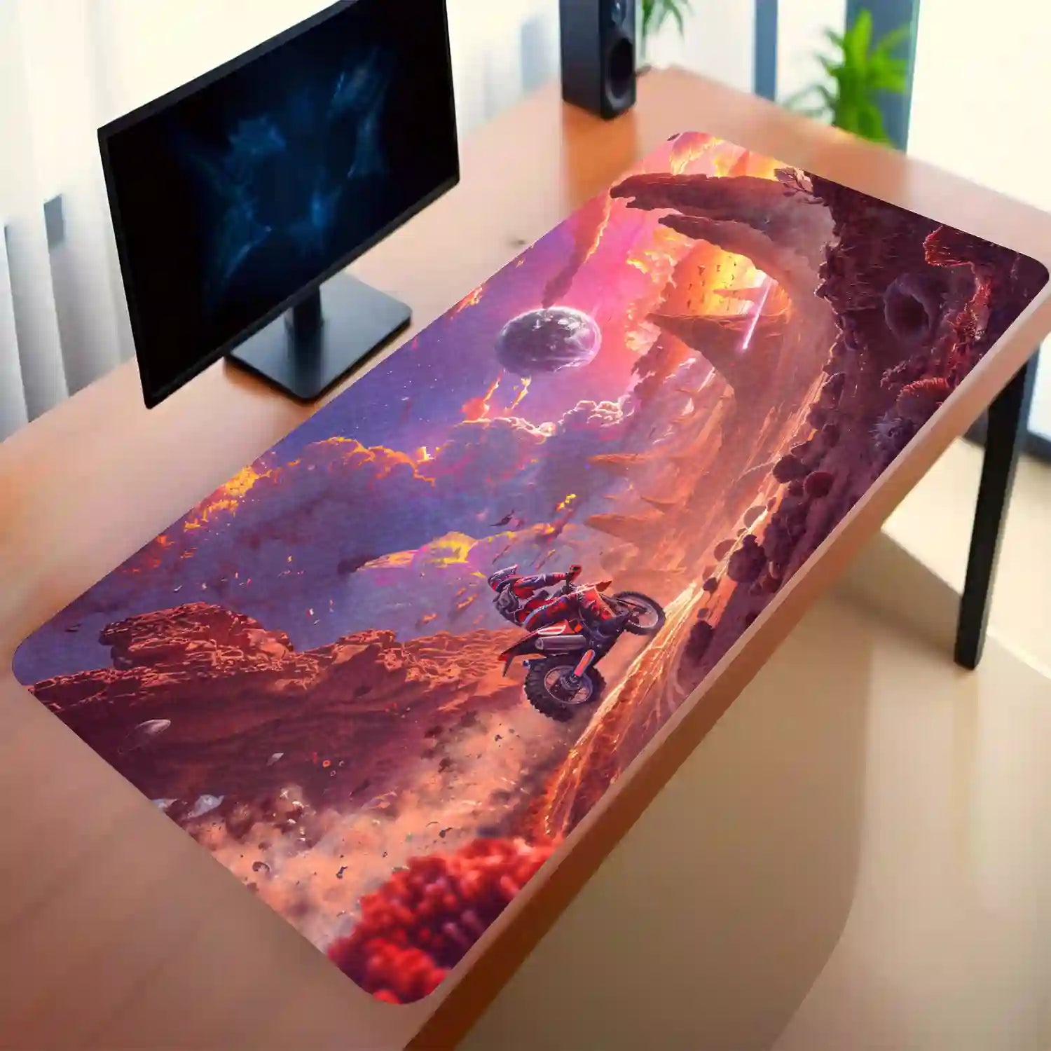 A biker navigates through an alien desert, the terrain bathed in eerie, otherworldly hues, under a vibrant, colorful sky filled with cosmic wonders. Such a sci-fi dream!