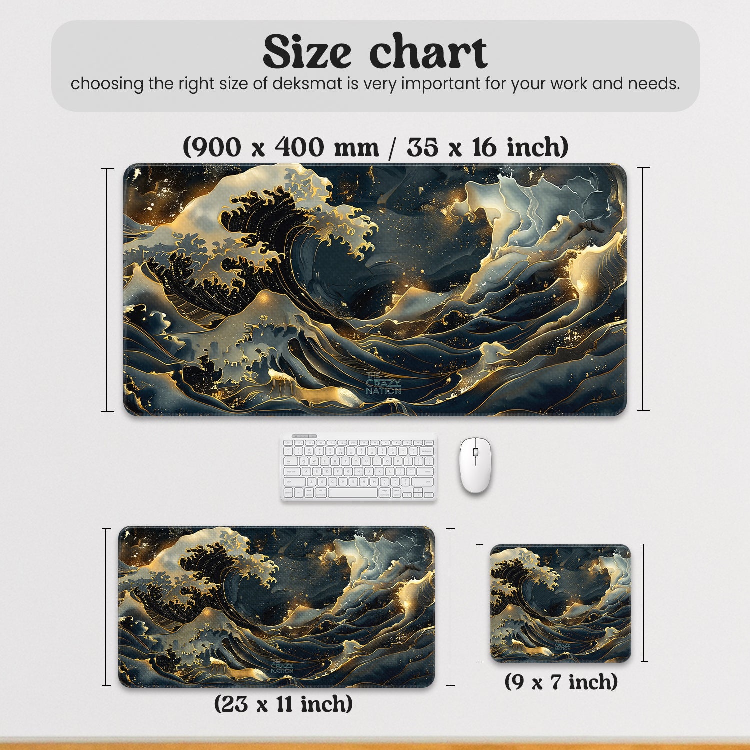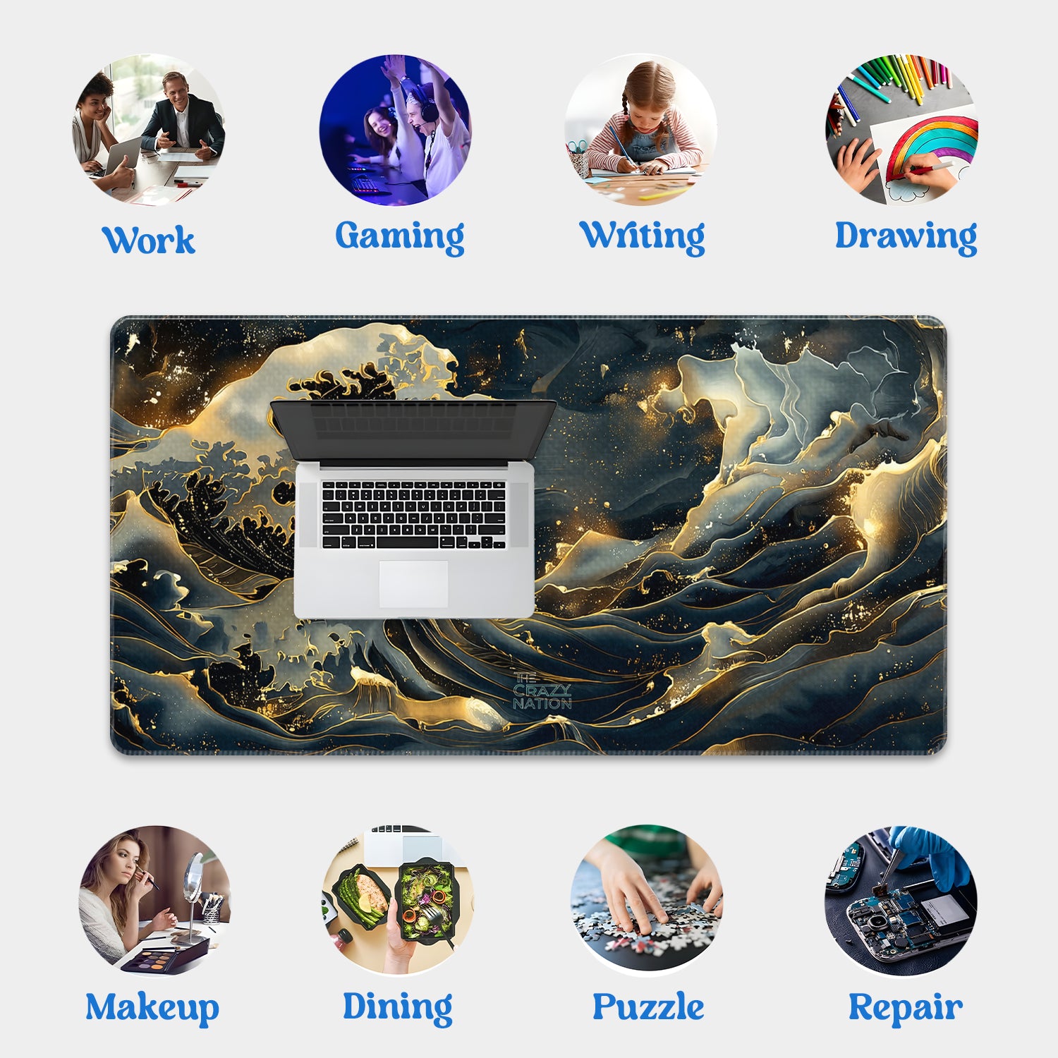Elevate your workspace with the Celestial Golden Wave Desk Mat by The Crazy Nation — where cosmic energy meets artistic brilliance. Featuring a dynamic, abstract interpretation of ocean waves infused with golden cosmic accents, this desk mat turns your setup into a visual masterpiece
