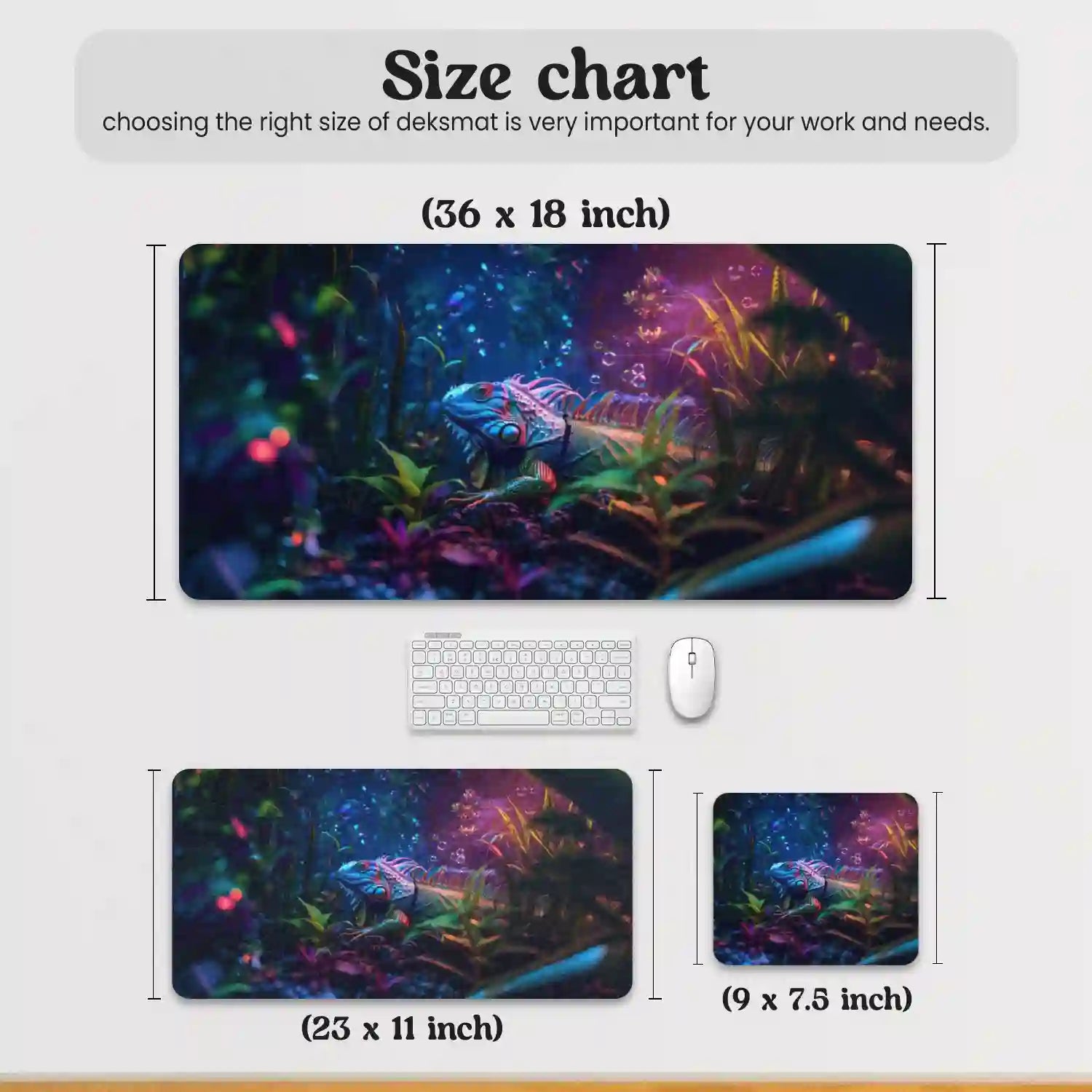 This vibrant and surreal image depicts an iguana in a fantastical jungle setting. The scene is illuminated with a spectrum of neon colors, creating a dreamlike atmosphere.