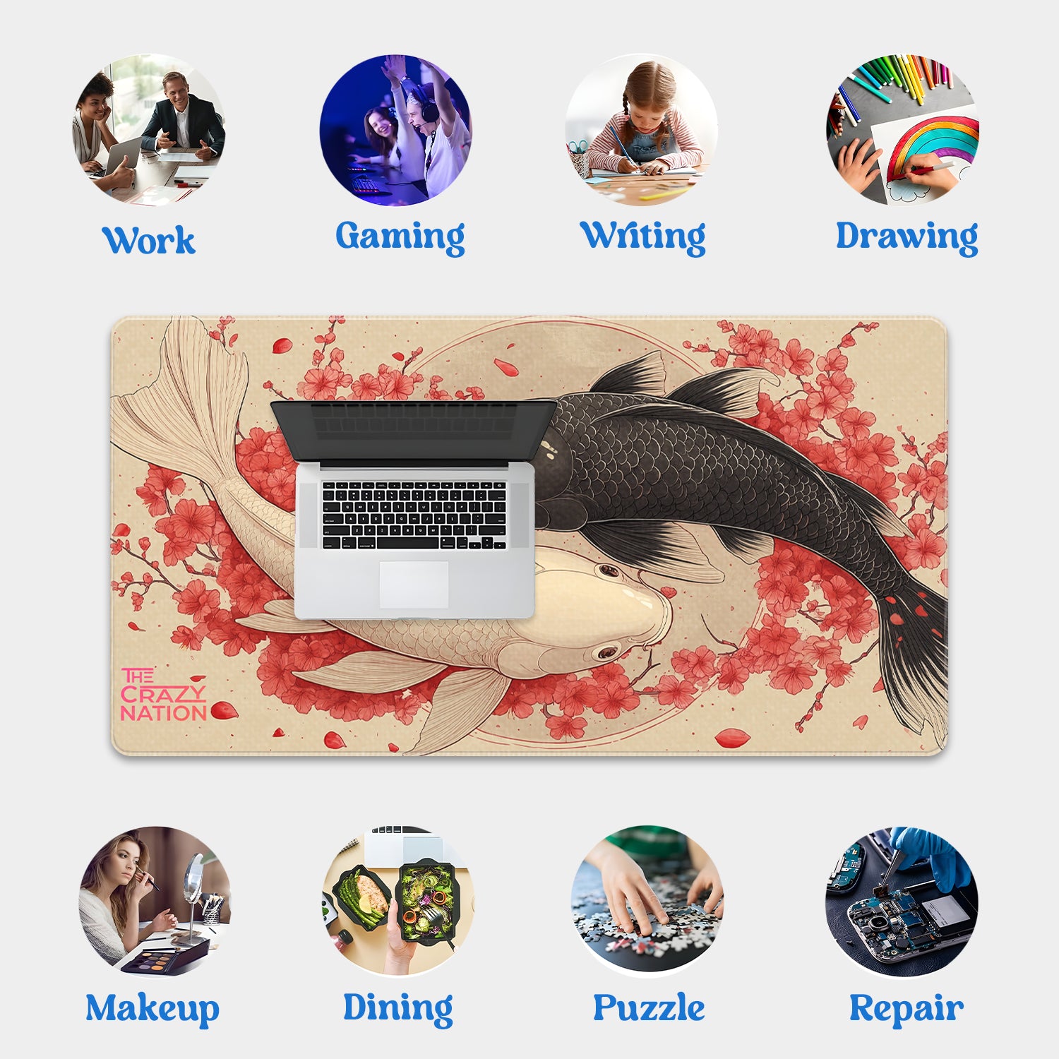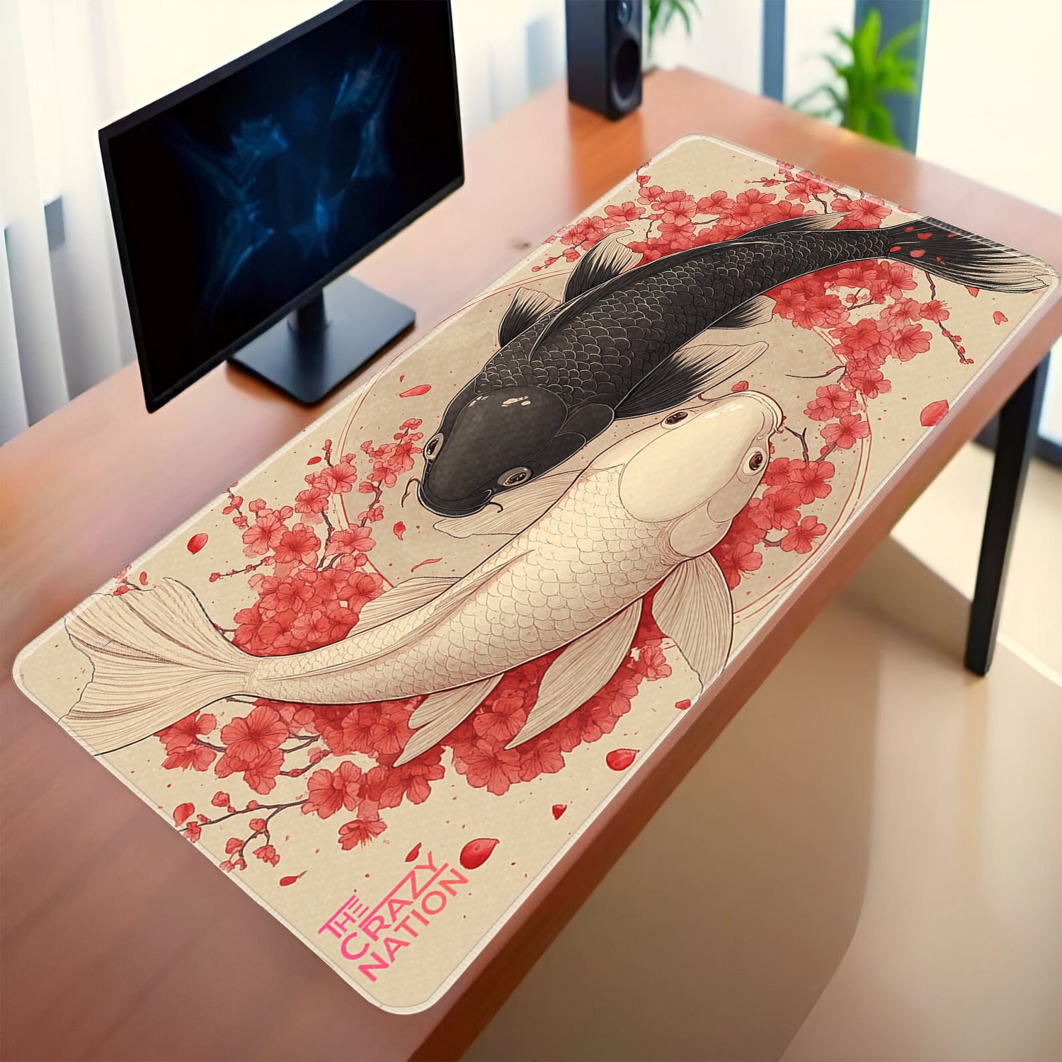 Transform your workspace with the Koi Fish & Cherry Blossom Desk Mat from The Crazy Nation. This extra-large extended mousepad features an elegant design of black and white koi fish intertwined in a yin-yang style, surrounded by vibrant cherry blossoms. Symbolizing balance, harmony, and renewal, this artwork adds a calming yet inspiring aesthetic to any desk.
